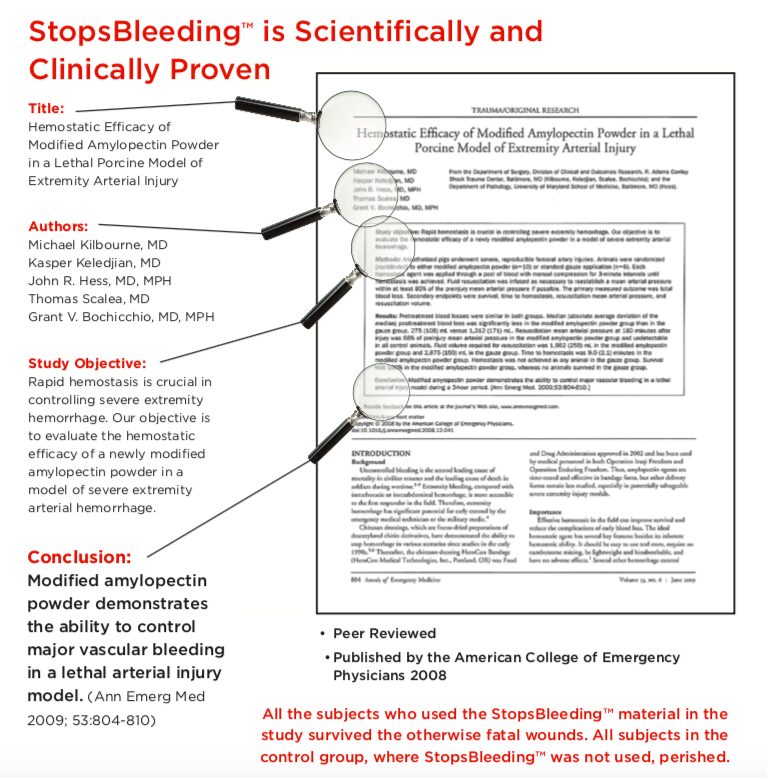 This animal study, conducted by five independent medical doctors, was performed on swine by completely severing femoral arteries. The results were peer reviewed, it was presented at a major medical conference, and it has been published in a major medical journal.